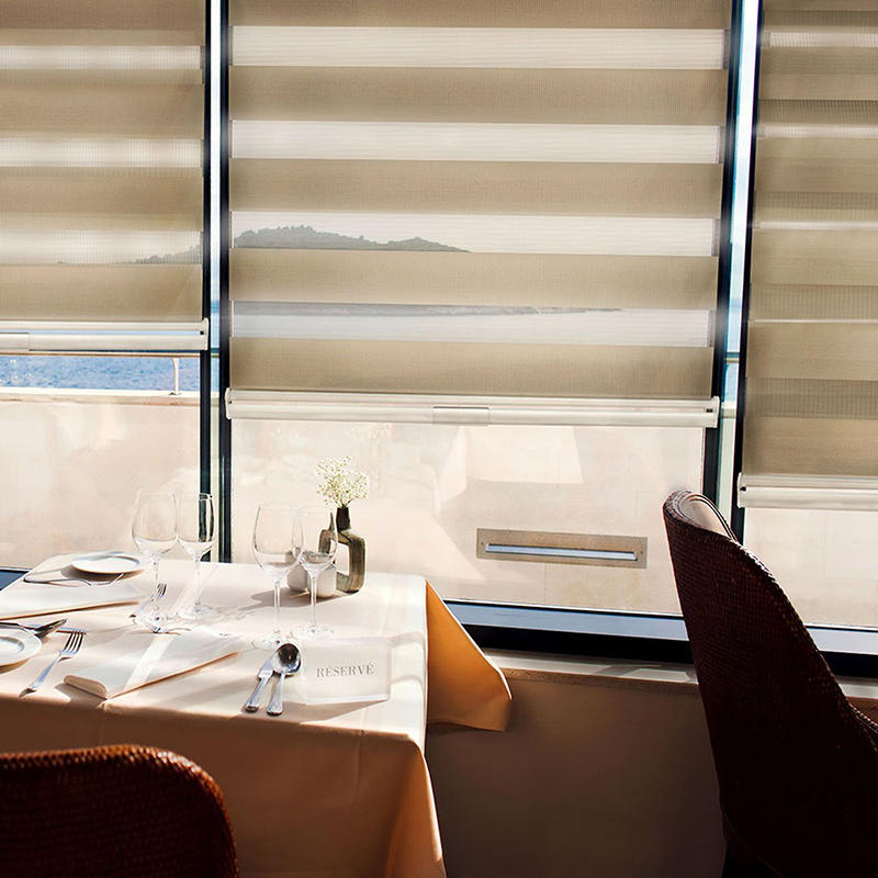 Las persianas de cebra inalámbricas de doble capa son tratamientos para ventanas que cuentan con dos capas de tela.La primera capa consiste en una tela transparente que permite que la luz natural ingrese a la habitación y ofrece un grado de privacidad.La segunda capa se compone de un tejido sólido que bloquea la luz y proporciona total privacidad.